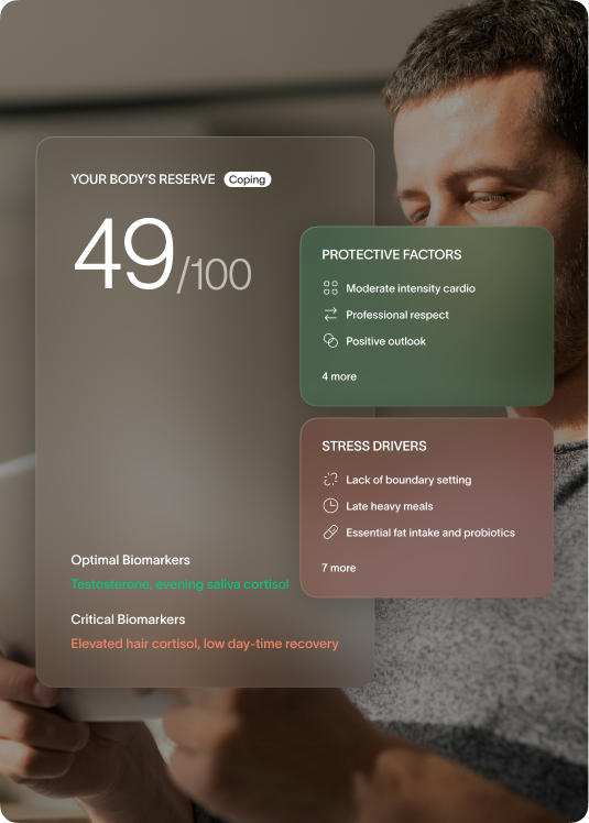 We begin with a multi-modal diagnostic protocol - combining salivary cortisol profiling, HRV tracking, hair steroid analysis, and validated self-assessments. This allows us to identify individual energy leaks and missed recovery opportunities with clinical-grade accuracy.